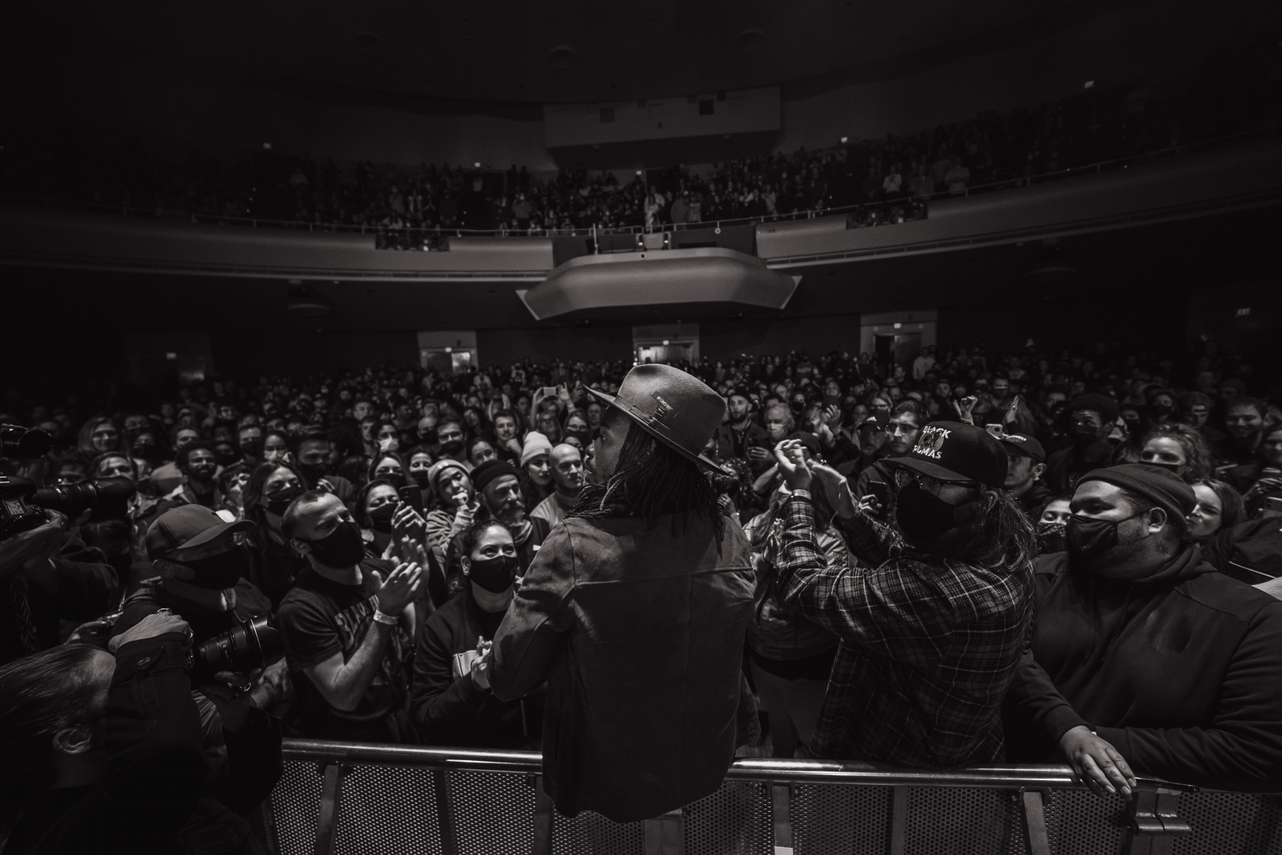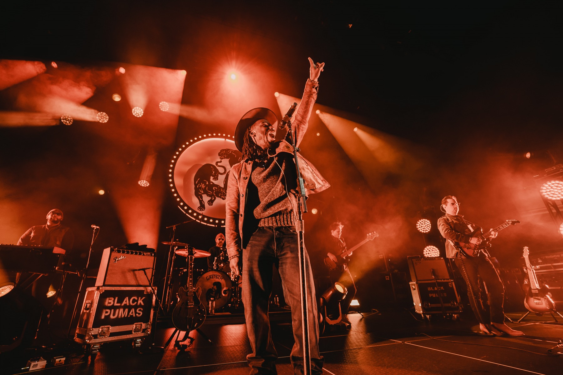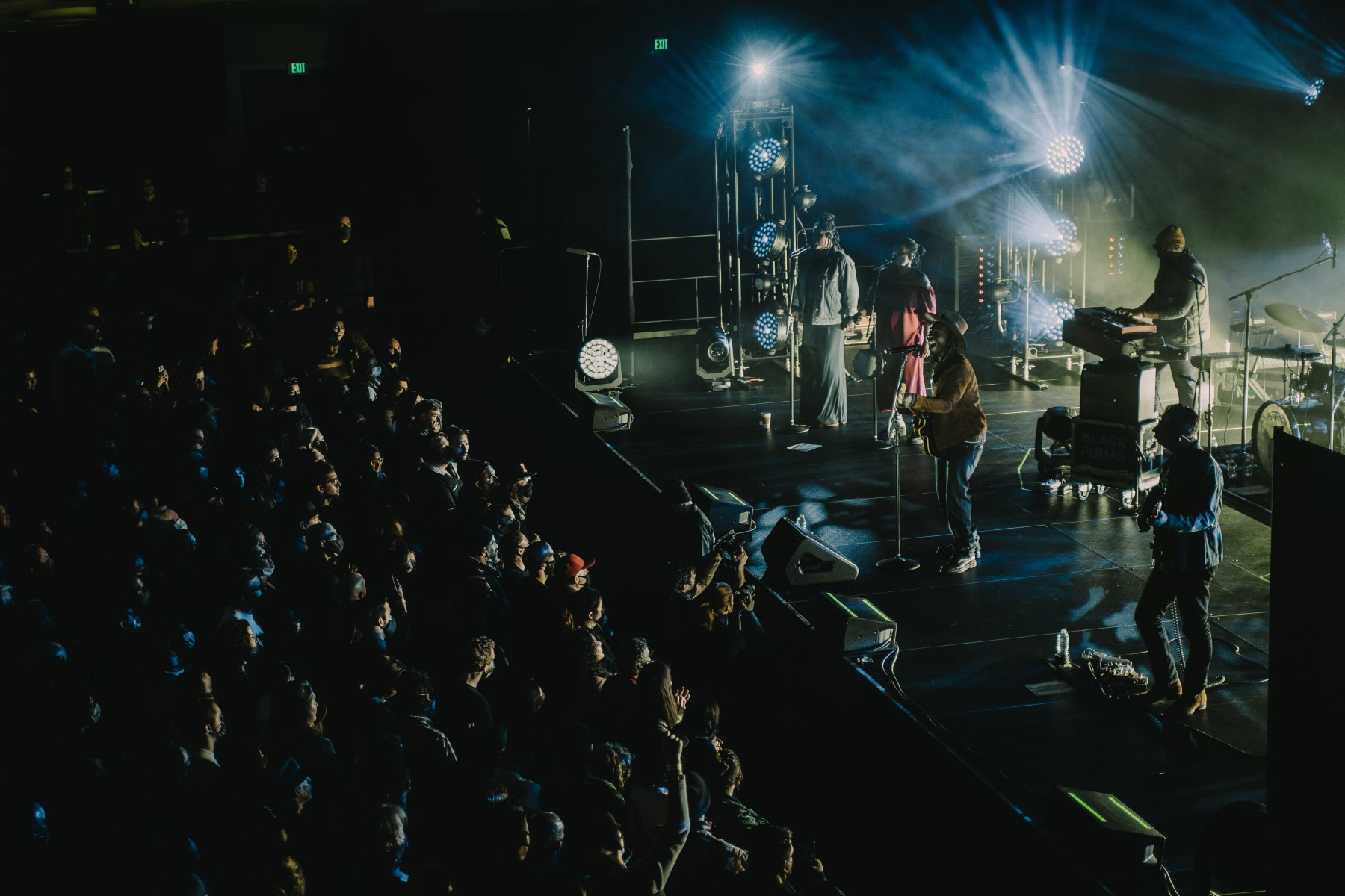 As the holiday season and rain roll into San Francisco on an early December night, Black Pumas took the stage to an energetic crowd at the SF Masonic in San Francisco, CA. The Austin-based rock band – made up of vocalist Eric Burton and guitarist Adrian Quesada – are currently on an extended US fall and winter tour in support of their debut album, Black Pumas. The band was just nominated for three Grammys, including album of the year for Black Pumas (Deluxe Edition), and both record of the year and best American roots performance for the track “Colors.”